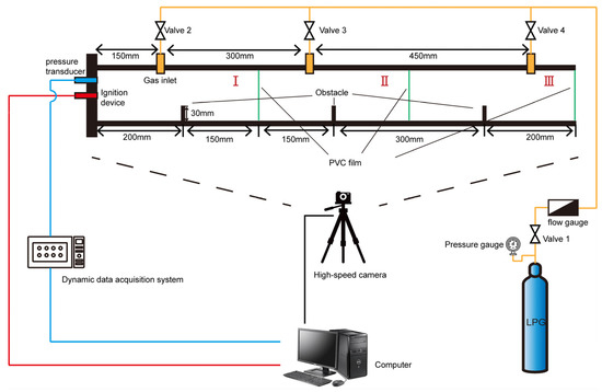 Figure 2 is a schematic diagram of the experimental system. The left end of the duct is closed. In order to prevent the premixed gas from leaking out, the outlet of the duct is sealed with a polyvinyl chloride (PVC) film. Before the experiment, in order to form three parts with different concentrations of combustible gases, PVC films are used to separate them at the distance of 350 mm and 650 mm from the ignition source, and then the three chambers in the duct were inflated separately. The concentration inside each gas chamber is uniform, and the equivalence ratios of the three regions are 1.5, 1.2 and 1, respectively. In addition, the LPG charging rate is controlled in terms of the pressure gauge and flow gauge. The high-speed camera is placed in front of the observation window with appropriate shading measures. After proper preparation, the adjustable igniter is used for ignition, which can be adjusted by knob voltage to determine the ignition energy. The model of the igniter is KTGD-B, and the ignition energy used in the experiment is 20 J. In each experiment, LPG is injected into the chamber through the upper plate of the duct. When the combustible gas is ignited and exploded, the PVC film ruptures and the combustion gas and unburned gas rush out of the duct. A CY-301 type digital pressure transducer is used to collect pressure data. The range of the pressure sensor is 0 to 5 Mpa. The accuracy of the pressure transducer is 0.1%FS, and the sampling rate is 1000 times per second. A high-speed camera with 1280 × 1024 pixels is used to record the explosion process simultaneously in the experiment, and the version of the high-speed camera is MC1362. To ensure the validity of the experimental data, the explosion experiment is repeated at least three times, and we take their average.