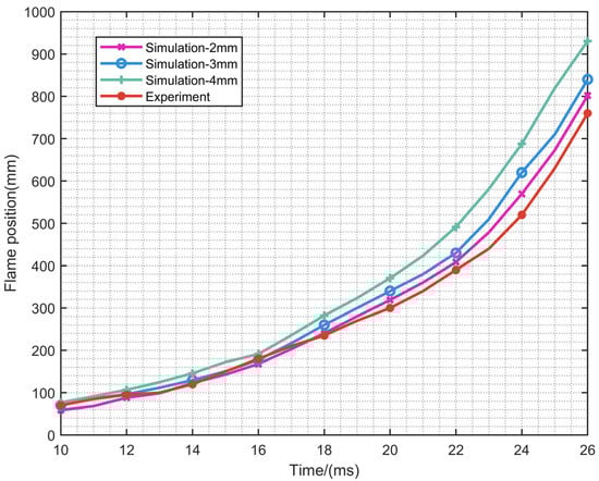 Figure 4 presents the flame position with the time under various grid resolutions. To verify the grid independence, numerical simulations are applied with three different gird resolutions, 2 mm, 3 mm and 4 mm. By calculating the maximum distance between the flame and the ignition source, the tip position of the flame is obtained. The simulations are validated by the experimental results. In addition, there is no obvious difference between the simulations obtained by these three grids. Note that the smaller grid resolution can better reproduce the experimental data. Considering the limitation of laboratory computing power and computing time, this paper chooses 3 mm × 3 mm × 3 mm as the grid resolution.