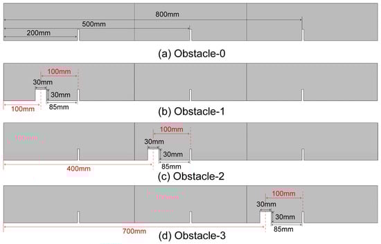 This paper focuses on the effects of mixed obstacles on the overpressure characteristics and flame behavior during the deflagration of LPG-air premixed combustible gases with concentration gradients. Figure 7 shows the duct model with mixed obstacles. With the blocking rate and number of flat obstacles unchanged, a rectangular obstacle is added. Since the total length of the pipeline is 1000 mm, the aspect ratio is 10/1 [45]. The distances between the three flat obstacles are the same. The three flat obstacles are respectively 200, 500 mm and 800 mm away from the ignition source. For Obstacle-1, a rectangular obstacle is placed in the middle of the ignition source and the first flat obstacle. In order to ensure that the distance from the rectangular obstacle to the flat obstacle in the three configurations is the same, the distance from the location of the geometric center of the rectangular obstacle to the ignition source is 100 mm, 400 mm and 700 mm. In addition, a control group without the rectangular obstacle is set up.