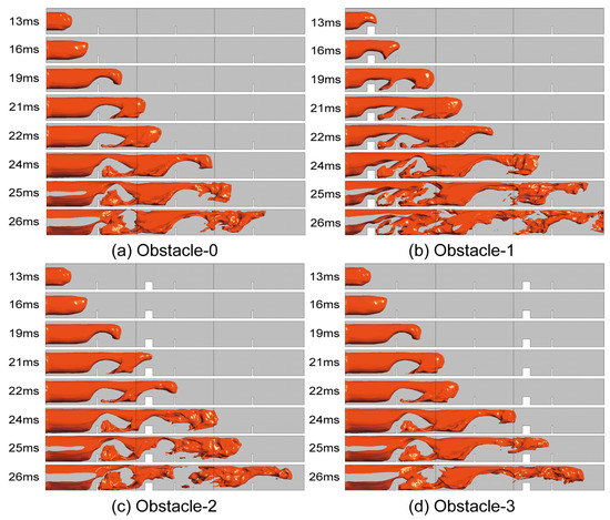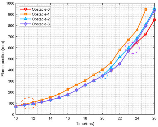 Figure 9 shows the variation of the front tip of the flame position with time for the four configurations. The time when the front tip of the flame touches the rectangular obstacle has been marked with circles in the figure. It can be seen that Obstacle-1 is the first to touch the rectangular obstacle, and the compression of the flow field by the obstacle leads to further increase of the speed of flame propagation. The front tip of the flame position has exceeded the other three models after 12 ms. At 21 ms, the flame in Obstacle-2 touches the rectangular obstacle and the speed of flame propagation starts to increase. Similarly, at around 23 ms, the flame starts to be affected by the rectangular obstacle and the flame spreads faster in Obstacle-3. After 26 ms, the front tip of the flame of Obstacle-2, Obstacle-3 and Obstacle-0 can rush out of the duct one after another. This result is consistent with the order of contact with the rectangular obstacle, which shows that the closer the rectangular obstacle is to the ignition source, the faster the speed of flame propagation rises, and the earlier the flame rushes out of the duct.