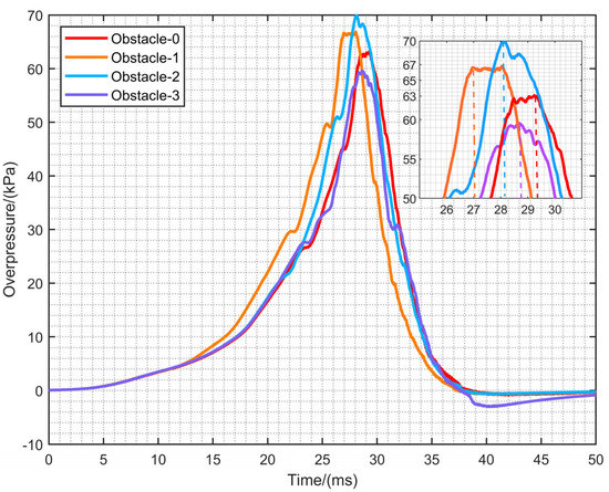 Figure 10 shows the comparison of the pressure of the rectangular obstacle at different positions during the simulation. The pressure increases slowly before the front tip of the flame touches the obstacle and the four curves almost overlap. The pressure of Obstacle-1 starts to rise sharply after 13 ms. It can be concluded from Figure 9 that this is because the flame is excited by the rectangular obstacle at this moment. In addition, the maximum overpressure value of Obstacle-2 is the highest among the four configurations, reaching 70 kPa. This is because the rectangular obstacle in Obstacle-2 is located at 400 mm and the flame is more fully developed [17] before reaching the rectangular obstacle compared to Obstacle-1. For Obstacle-3, the rectangular obstacle is closer to the outlet, and the flame rushes out of the duct after passing through the obstacle. This is detrimental to the increase in overpressure, so the maximum overpressure is lower than Obstacle-0. The maximum overpressure occurs after the flame rushes out of the duct, and it can be seen that the time to reach the maximum overpressure is about 29.2 ms, 27 ms, 28.1 ms and 28.6 ms. In four configurations, which indicates that the closer the rectangular obstruction is to the ignition source, the shorter the time required to reach the maximum overpressure. After 26 ms, the flame gradually rushes out of the duct, taking away a large number of combustion products and unburned gas. As a result, the pressure in the duct gradually decreases. Interestingly, after 30 ms, the pressure rises slightly on the way down, which is precisely because the outside air rushes into the duct and forms convection with the combustion gas in the duct. After 37 ms, the negative internal overpressure is generated. It can be clearly seen that the negative pressure of Obstacle-3 is the most obvious. This is because the rectangular obstacle is closer to the outlet of the duct and has a stimulating effect on the flame at the outlet. This allows more gas to rush out of the pipe in a short period of time, bringing a greater negative pressure. After that, due to the pressure difference, the outside air is pressed into the duct. Then, the rest of the fuel burns again, and the overpressure can rise again to a certain extent. Then, the reciprocal outflow and reverse flow of the gas mixture gradually tends to balance, and the overpressure inside the duct returns to normal atmospheric pressure finally.