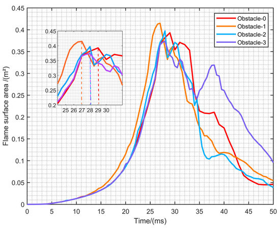 Figure 11 depicts the relationship between the area of flame and the time on the iso-surface for the reaction process variable c = 0.95. After ignition, the area of flame in the duct increases slowly. The area of flames of Obstacle-1, Obstacle-2 and Obstacle-3 increased further after 12 ms, 21 ms and 23 ms, respectively. This result coincides with the time when the front tip of the flame touches the rectangular obstacle in Figure 9. After 37 ms, it can be seen that the area of flame under the four configurations has a rebound. This is due to the pressure difference causing the outside air to enter the duct, and the combustible gas is fully burned, which further increases the area of flame. Combined with Figure 10, it can be found that the variation of the area of flame with time before reaching the maximum area of flame is consistent with the variation of overpressure. Obstacle-0, Obstacle-1, Obstacle-2 and Obstacle-3 show the maximum area of flame at 29 ms, 27 ms, 28 ms and 28 ms, respectively. This result is almost the same as the time to obtain the maximum overpressure in Figure 10. This confirms that the maximum overpressure value is obtained when the area of flame is the largest. In addition, among the four configurations, Obstacle-1 has the largest peak area of flame, followed by Obstacle-2 and Obstacle-0, while Obstacle-3 is the smallest, which is also consistent with the variation of maximum overpressure. To sum up, it shows that the overpressure is closely related to the area of flame.