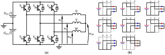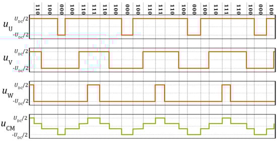 The sequence and switching times of the individual transistors are controlled by a vector modulator in the control system. The examples of the output voltages of a two-level converter, uu, uv and uw, are shown in Figure 3. The voltages on the individual phases of the winding assume values that depend on the voltage in the DC-link circuit UDC: UDC/2 or −UDC/2. The result of the voltages at the output of the converter formed in such a way is the presence of a non-zero voltage at the neutral point of the winding called the common-mode voltage uCM, the value of which is equal to the average value of the voltages in the individual phases according to formula (2) []: