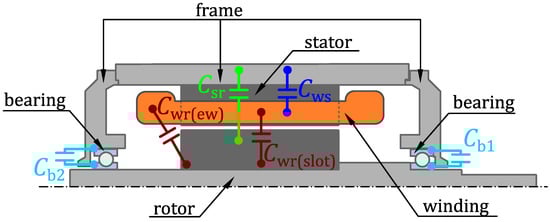 Bearing in mind the insulation between the stator winding and the ferromagnetic circuit, as well as the isolation of the rotor from the other structural components of the machine (due to the presence of an oil film in the bearings), one can formulate its equivalent circuit diagram that consists of parasitic capacitances []. In a simplified model of an electric machine, capacitances can be distinguished: Cws—the capacitance between the stator winding and the grounded stator, Cwr—the capacitance between the stator winding and the rotor, Csr—the capacitance between the rotor and the grounded stator, Cb1 and Cb2—the capacitances of the bearings on the drive and non-drive sides []. It is worth noting that the capacitance Cwr occurs both along the active length of the stator iron core and in the end-windings region. Thus, it is possible to distinguish two components of Cwr capacitance connected in parallel: Cwr(ew) and Cwr(slot), which correspond to the capacitance between the windings located in the stator slots and the end-winding capacitance, respectively []. The location of the above-mentioned parasitic capacitances is illustrated in a cross-sectional view of the electric machine in Figure 4, whereas the equivalent diagram with lumped parameters is shown in Figure 5. It is worth noting here that, in the case of supplying the stator windings with a sinusoidal voltage at the frequency of f = 50 Hz, these capacitances do not play any role in generating bearing voltages due to the large value of reactance Xc = 1/(2πfC).