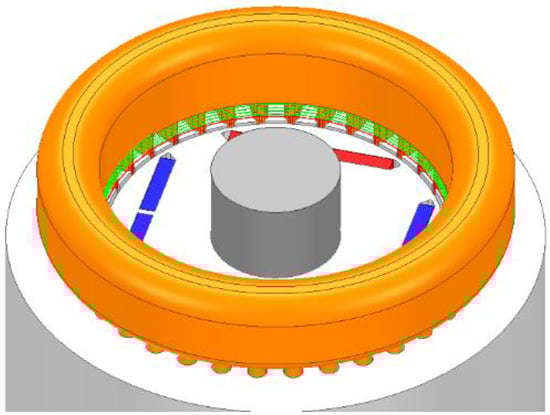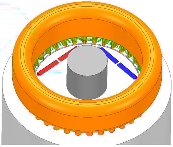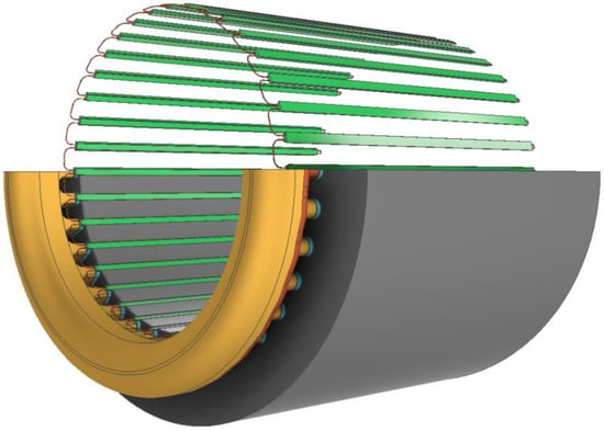 According to the previously described concept, the shielding winding was added to the reference model from Section 4.1, located in the wedges closing the stator slots. This winding consists of 72 copper wires, with 2 wires placed in each wedge, connected in series, as shown in Figure 11.