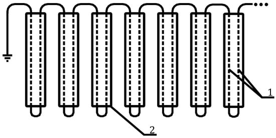 The concept suggested by the authors is based on the use of special wedges closing the stator slots, in which there are copper wires along the entire length. These wires can be connected, for example, in series, thus creating a special shielding winding, one terminal of which is connected to the grounded frame. Such a solution is characterized, among other things, by the following advantages: the wires are evenly distributed in the wedges along the entire slot opening length of the stator core and are also prevented from accidentally touching the stator winding. The concept and an exemplary connection of the wires in the slot wedges are shown in Figure 6 and Figure 7.