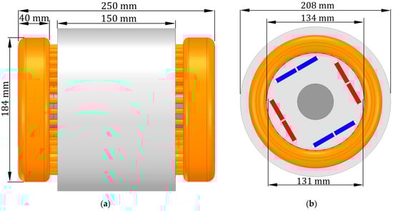 Reference model of a PMSM machine with an IPM rotor, with the most important geometrical dimensions marked: (a) side view, (b) front view.
