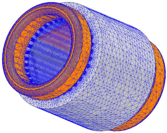In order to ensure reliable results of the simulation model calculations, the finite element mesh was parameterized in a way that ensures a high density of finite elements in the key spaces of the model, particularly in the space between the stator and the rotor. The generated mesh is shown in Figure 9. The number of mesh elements was approximately 8.9 million tets.