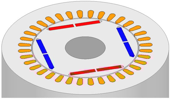 In order to determine the parasitic capacitances of an electric machine, a three-dimensional simulation model of a synchronous machine with permanent magnets placed inside the rotor (IPM) was developed. The choice of such a machine model is due to the numerous advantages of such design. These include, first of all, the presence of a reluctance torque, which interacts with the torque produced by the permanent magnets []. The reason for the presence of the reluctance torque is the magnetic asymmetry of the rotor, since the reluctances for the armature interaction fluxes in the direct and quadrature axes are not equal. Compared to machines with SPM rotors, IPM rotors have a higher torque overload and also do not require additional protection against the effects of centrifugal force on the magnets.