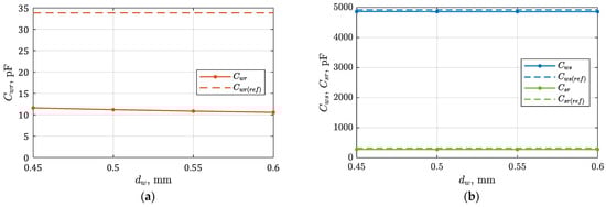 The results of the calculations of parasitic capacitances: Cwr (a) and Cws, Csr (b) for different diameters of the shielding wire and the length of the end-winding overhang lew = 2.5 mm compared to the capacitance values of the reference model.