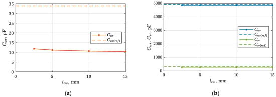 The results of the calculations of parasitic capacitances: Cwr (a) and Cws, Csr (b) for different overhang lengths of the shielding winding and the wire diameter dw = 0.5 mm compared to the capacitance values of the reference model.