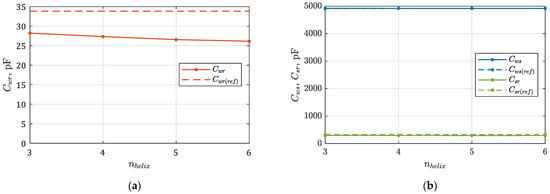 Results of parasitic capacitances calculations: Cwr (a) and Cws, Csr (b) depending on the number of turns of the helix shielding winding nhelix compared to the capacitance values of the reference model.