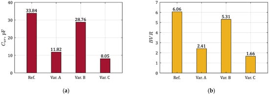 Comparison of capacitances Cwr (a) and BVR coefficients (b) for selected solution variants.