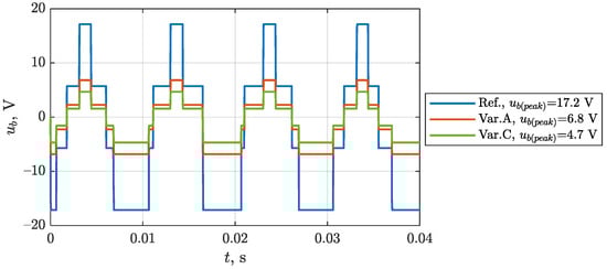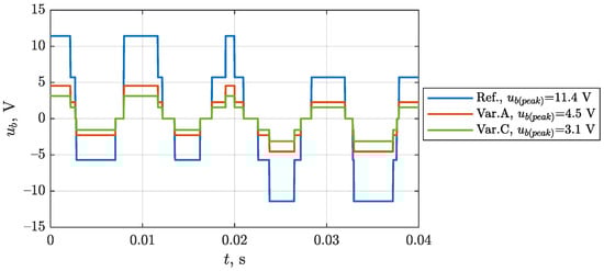 In order to complement the studies presented in the previous section, calculations of the bearing voltage were carried out when the machine was powered by a three-level converter containing neutral-point clamped (NPC) diodes []. This type of converter is the most common group of multilevel converters. The converter consists of 12 IGBT transistors and 6 leveling diodes. One way to limit the common-mode voltage is to eliminate the zero vectors from the control strategy, which are the source of the maximum amplitude of the common-mode voltage uCM []. The model of such a three-level converter is shown in Figure 20. The results of model calculations for selected variants of machine design solutions are shown in Figure 21. From the presented results, a reduction in the amplitude of the bearing voltage ub by 1/3 compared to a 2-level converter can be observed. In this case, the amplitude of the bearing voltage for the reference model is 11.4 V. The use of shielding windings in the machine contributes to reducing the amplitude of the bearing voltage to 4.5 V for variant A and to 3.1 V for variant C.