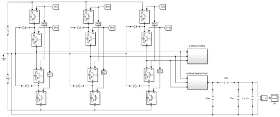 As shown in Section 2.1, the bearing voltage ub depends on the value of the common-mode voltage uCM and the values of the machine’s parasitic capacitances Cwr, Csr and Cws. The calculations presented in following subsections of the paper are aimed at answering the question: what is the effect of the machine shielding windings suggested in the article on the bearing voltage levels when fed from a PWM converter? In order to answer this question, circuit models of two-level and three-level DC/AC converters were developed. The converters, along with the machine winding system and parasitic capacitances, were developed in the Matlab/Simulink environment. The following assumptions were made: