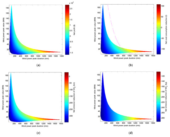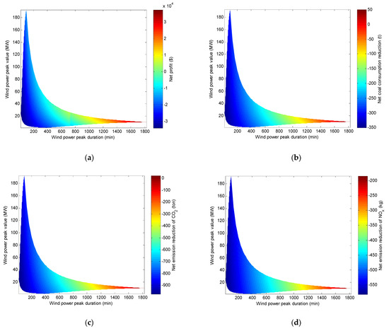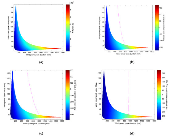 Compared with the wind energy curtailment strategy, the relationships between the net profit/net reduction of the wind–coal combined base load power generation system and the wind power peak height H and peak width T are shown in Figure 6.
