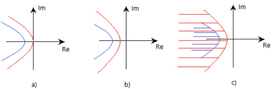 Thus, . It is easy to see that the spectrum of on is the non-negative semiline , and the spectrum of on satisfies for some ; thus, Proposition 1 is proven. Moreover, the same argument shows that if Γ is the curve that bounds the spectrum of on the right, then is the entire solid part of the plane bounded by Γ. We use Figure 1 to illustrate the spectrum of the linear operator on different spaces; in the weighted space, the spectrum is away from the imaginary axis and the operator extends in a semiline to negative infinity at each point on the original spectrum.