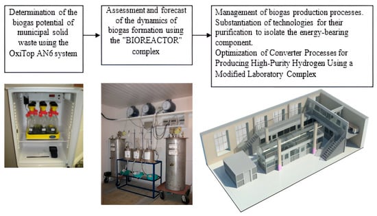 The methodology for organizing a multi-stage laboratory experiment (Figure 1) for obtaining biogas, its purification from impurities and, in the future, the production of biohydrogen was developed based on field studies in Peter the Great St. Petersburg Polytechnic University [36].