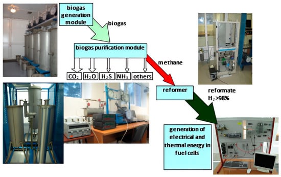 Model samples of the studied wastes, from which biogas was formed in the process of methanogenesis, were placed in the bioreactor module. Within the framework of the first module, the volume and composition of biogas were controlled, and the chemical composition of the filtrate was determined. In the second module, based on adsorption–cryogenic treatment, harmful impurities were removed from biogas and the methane component was isolated. Furthermore, the biomethane purified from impurities was supplied to the reforming module for its steam conversion into biohydrogen. Next, biohydrogen entered the module, consisting of low-temperature fuel cells, where it was converted into electrical energy.