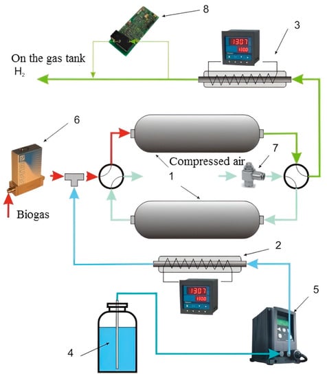 The sorption–catalytic scheme was used to produce hydrogen. This scheme combined the process of steam reforming of hydrocarbons with high-temperature purification from carbon dioxide. The studies were carried out on an experimental setup (Figure 3) with a capacity of up to 60 L H2/hour with thermal regeneration of the absorber. The synthesized granular calcium oxide was used as an absorber [45], as a catalyst for steam reforming—NIAP-03 (11% NiO/Ca2Al2O5) and methanation—NIAP-07 (36 wt.% NiO/Al2O3).
