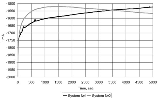 The resulting hydrogen-containing mixture (with a hydrogen content of up to 98% by volume) was fed into a low-temperature fuel cell. Tests have shown that a hydrogen mixture containing up to 2% CH4 (vol.), with direct supply (dead end) to the fuel cell in a potentiostatic mode at a constant potential E = 500 mV, using air oxygen as an oxidizer (Figure 4, curve 1), for a sufficiently long time (~(1.2 ÷ 1.4) 104 s) does not require adjustment for the discharge of unspent fuel from the anode [47,48]. Similar studies were carried out using electrolytic hydrogen (99.999% vol) (Figure 4, curve 2).