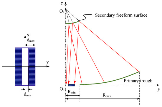 As shown in Figure 2, the optical axis of the primary trough concentrator is arranged coincident with z-axis. Origin O1 is the parabolic center. The PV and thermal absorber are both arranged along the x-axis at z = 0. O2 is the focus point of the primary mirror. Rmin and Rmax are the inner and outer widths of the primary trough concentrator, respectively. rmin is the inner width of the PV receiver, and rmax is the outer width.