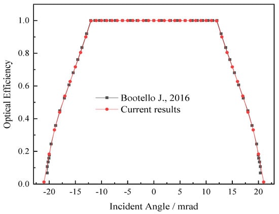 To verify the ray tracing model in the current study, the simulated optical efficiency has been compared with the LS3 model [22] at different incident angles, as Figure 6 shows. It can be found that the distributions fit very well. It should be noted that the simulated optical structure remains the same, and solar cone angles for both have not been taken into consideration.