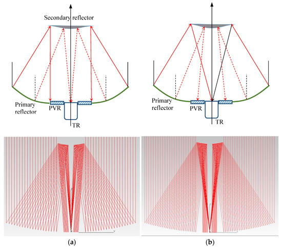 It is interesting to firstly discuss the optical transmission of different CPV/T forms. As shown in Figure 7, the forward transmission means the outer region of the concentrator reflects solar rays on the external PV panel, and the inner region reflects rays on the internal thermal tube. By contrary, the backward transmission means two regions of concentrator lead to a crossed ray path corresponding to different receivers with an opposite order of PVR and TR sequence. The geometrical parameters of a simulated TFSC are presented in Table 1. The outer width of PVR was calculated based on the concentration and inner width according to the above Equation (7). The data of calculated points are presented in the Appendix A Table A1.