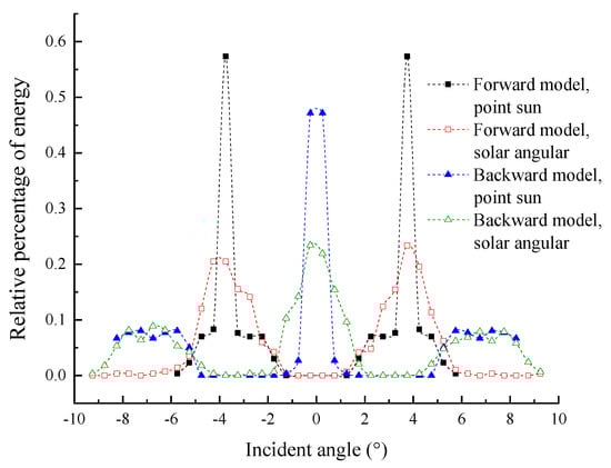 The optical transmission vectors/incident angles are the main differences between forward and backward models. The relative percentages of radiation energy with incident angles are presented in Figure 5. The simple point sun model cannot satisfy the real working condition of the designed solar concentrator. Therefore, the angular diameter of the sun 32 arc minutes has also been included in the simulation. We can clearly find that the changing trend with incident angles becomes more moderate for the solar angular model compared with the point sun model, meaning that the collected sun rays are more divergent. Under the pattern of forward transmission, we can find in Figure 8 that the most receiving solar rays by PVR are nearly parallel, and this has led to the fact that the peak percentage for the point sun model reached 0.573. The same point for the PVR component is only 0.234 when considering the solar angular effect. The incident angle for TR ranges between 1.25° and 5.75° depending on the cutting edge of the secondary reflector. For backward transmission, the incident solar rays received by PVR present nearly vertical. The rays by TR, however, present a 4.25°–9.25° receiving angle, when the heat loss would be enlarged. At the same design parameters, forward transmission gains more advantages. Therefore, the following work primarily focuses on the forward transmission pattern.