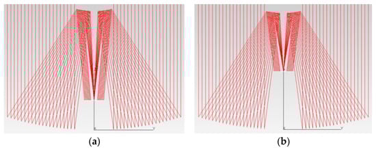 A solar angular model with approximately 32 arc minutes’ incident divergence will enlarge the receiving size and make the actual CE different with the present concentration of CG. Figure 12a presents the heat flux distribution considering the solar angular angle. The peak solar concentration is much lower compared with the one shown in Figure 11. However, the transient area is becoming fuzzy, which makes the heat flux on both receivers as a continuous distribution. It is predictable that the transient area can be enlarged by moving the preset PVR receiving position outwards. There are some escaped rays from the central hole of the primary trough and hit on the receiver, which make the heat flux on the blank region present as nonzero.