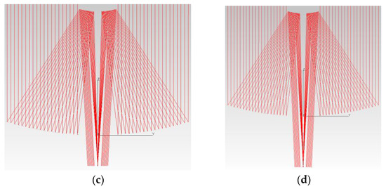The height of the receiving component can directly decide the curvature and shape of the secondary free-form surface. This effect has been presented in Figure 9 when the height is between −2 m and ~2 m, and the solar angular effect had been ignored to make it more clear. To avoid the occlusion influenced by PVR to the optical path reflected by the primary mirror, the concentration ratio was set to be 60 suns. As can be seen from this figure, the concentrated solar rays are divided into two parts: some are reflected to the TR in the center, and the others are reflected to the PVR outside. The blank areas between the TR and PVR have become more apparent with the increase of the receiving height; as the optical path is longer, the error caused by discrete points and surface generation dramatically. This can be easily found in Figure 9d, a ray branch happens at the center of the TR when the height is −2 m, instead of one point at the same position.