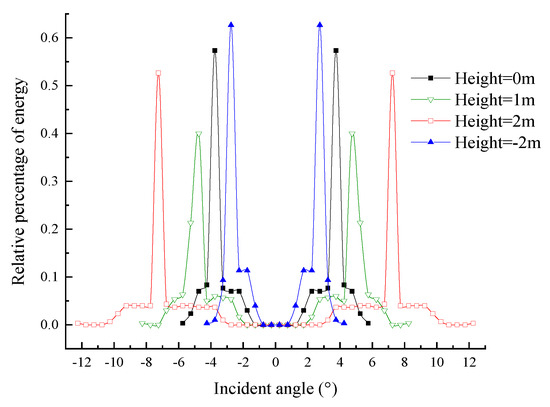 Considering the solar angular angle effect, the distribution of receiving vectors is presented in Figure 10. With the increasing height of the receiver, the incident angle was noticeably enlarged, and the cover range become wider. For instance, when the height is equal to 0 (at the origin point of primary parabola mirror), the incident angle is among 1° to 6°, and the peak is at 3.25°. When the height is 2 m, the incident angle is between 3° to 13°, and the peak is at 7.25°. It should be noted that the incident angle and transition zone meet a compromise. For practical application, the receiver can be located at a lower position to obtain a smaller solar incident angle. At the same time, the overlapped effect for the transition area becomes more obvious and needs to be considered, which increases the risk of overheated/burnout of the PVR.