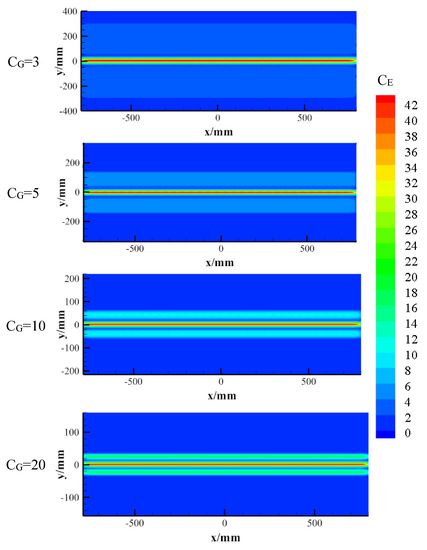The Geometric Concentration Ratio (CG), defined by Formula (7), is an important preset parameter that influences simulated heat flux on PVR. Figure 11 shows the 2-D distributions with different CG targets between 3 and ~20 suns. Concentrated Energy Ratio (CE) is calculated by the receiving heat flux divided by 1000 W/m2 (one sun energy density). We can find in Figure 11 that the heat flux distribution around the central TR remains the same, and the highest energy concentration ratio reaches 42 suns. For the PVR, the concentrated heat flux distributes uniformly, and the covering size becomes smaller with the increase of the CG values.