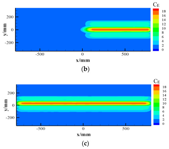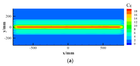 A trough-type solar concentrator with 2-D tracking design is usually mounted along a north–south axis and adjusted in real time from the east to the west. When there is no tracking error, the heat flux distribution is presented in Figure 12a. It can be found that the concentration value CE received by PVR is just around the target of 5 suns, and the central thermal receiver collects most of the radiation energy. When the sun rays tilted to the x + direction with a 3° inclination, the entire received heat flux distribution deviated from the left boundary with the length of 900 mm, as Figure 12b shows. In addition, the PV concentrated energy distributes similarly as before in the local receiving region for x > 100 mm. For the TR component, this will lower the heat transfer temperature. For the PVR component, the strategy of series-parallel circuit connections for PV cells needs to be considered.