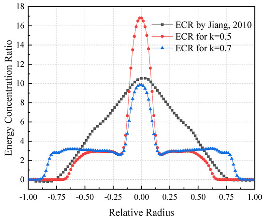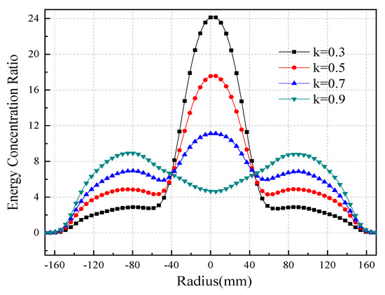 In addition, the ECR distributions in the current model have been compared with reference to show the advantages of TFSC. Figure 15 presents the radial distributions of ECR with different PVR occupation ratios and also the results in reference that simulated for a traditional two-stage solar concentrator [23]. Compared with a normal Gaussian distribution, it can be found that TFSC obtains unique advantages of more obviously separated heat flux regions and also more uniform distribution for PVR. Different k values mainly dominate the proportion allocation of PV and thermal power. The results show that TFSC fitting with hybrid PV/T receivers can better utilize the total Gaussian heat flux.