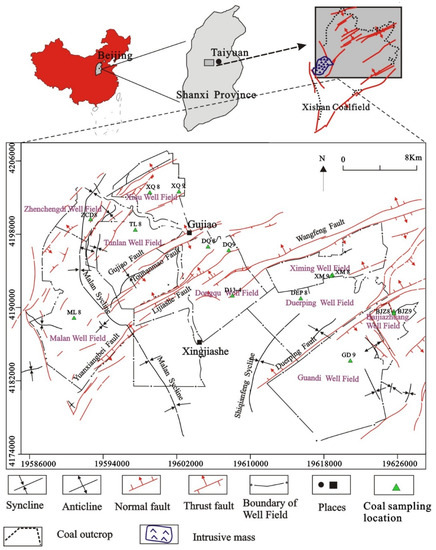 The samples were collected from No. 8 and No. 9 coals of nine coal mines in the middle and north of the Xishan coalfield according to the national standards of the People’s Republic of China (GB482-2008) (Figure 1). Because the coal seam is thick, samples were collected from the thick coal seam’s midpoint. The samples were prepared according to national standards of the People’s Republic of China (GB/T474-1996). Natural ventilation was used to dry the collected samples. The samples were crushed into 20-mesh, 80-mesh, and 200-mesh sizes according to GB474-2008 and prepared for observation of coal macerals as well as vitrinite reflectance measurement, proximate analysis, and determination of associated elements, respectively. The proximate analysis was performed at the Key Laboratory of Coalbed Methane Resources and Reservoir Formation Process of the Ministry of Education according to the GB/T212-2008. The total sulfur content in coal was determined using GB/T214-2007, and the test was completed at the Jiangsu Design Institute of Geology for Mineral Resources. The maceral classification in this study is based on Taylor et al. [23] and the ICCP System 1994 [24,25]. The elemental analysis was completed at the Regional Geological Survey Institute in Hebei Province. The major elements of the coal samples were determined via X-ray fluorescence spectrometry (Axiosmax) according to GB/T 14506.14-2010 and GB/T 14506.28-2010. ICP–MS (X series2) was used to determine the trace elements and rare earth elements per GB/T 14506.30-2010 [26].