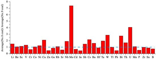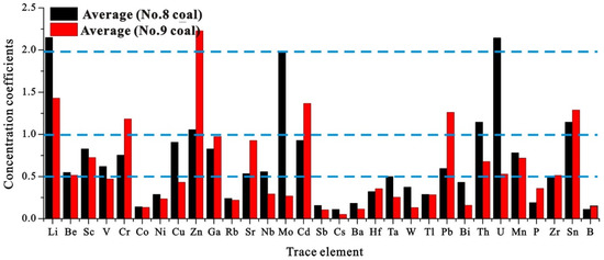 The enrichment coefficient is defined in this study as the ratio of trace element content of coal samples in the study area to Chinese coal. When the ratio is less than 0.5, 0.5–2, 2–5, 5–10, and greater than 10, it indicates depletion, similarity, slight enrichment, enrichment, and considerable enrichment, respectively [9,30]. Depleted elements include Co, Ni, Rb, Sb, Cs, Ba, Hf, Ta, W, Ti, Bi, P, and B of No. 8 coal and V, Co, Ni, Cu, Rb, Nb, Mo, Sb, Cs, Ba, Hf, Ta, W, Tl, Bi, P, and B of No. 9 coal.