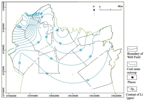 Li and U are minor enrichment elements in No. 8 coal. The Li content in DQ8 and ZCD8 are relatively high, with enrichment coefficients of 3.42 and 8.52, respectively (Table 5 and Table 6; Figure 6); Li content decreases from northwest to southeast, with a relatively fast decrease in the northwest. According to Sun et al. [31], the recovery and utilization index of lithium in raw coal is 120 µg/g. Therefore, the Zhenchengdi well field in the study area’s northwest and some areas of the Malan well field can consider the recovery and utilization of Li element in coal (Figure 7). Lithium content in coal gangue or close to coal gangue, the roof, and the floor is relatively high, and it is highly positively correlated with ash, gallium, and thorium elements. The most likely carriers for lithium adsorption are clay minerals [17].