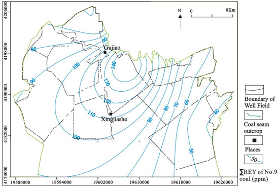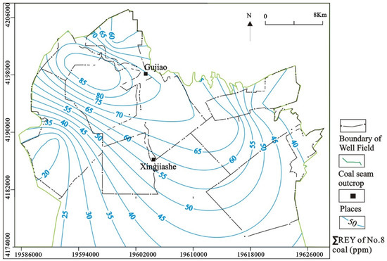 The total content of REY in No. 8 coal ranges from 17.65 to 98.51 μg/g, with an average of 60.74 μg/g. The content in the Baijiazhuang, Ximing, and Malan well fields are relatively low, and the content in the Tunlan, Duerping, and Dongqu well fields is relatively high (Figure 9). The total content of REY in No. 9 coal ranges from 41.93 to 165.80 μg/g, with an average of 75.55 μg/g, which is higher than that of No. 8 coal, similar to the distribution of No. 8 coal. The Dongqu well field has the highest content (165.80 μg/g), and it gradually decreases toward the west and east (Figure 10). The average content of REY in both coals are lower than that of Chinese coal (138 μg/g) [38] (Dai et al., 2016) (Table 7).