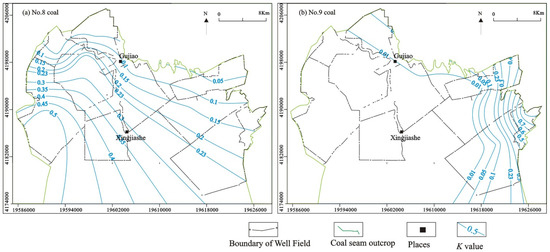 K = (Fe2O3 + CaO + MgO)/(SiO2 + Al2O3) can indicate the degree to which seawater or freshwater influences peat deposition. When K value ≤ 0.22, coal is primarily affected by freshwater during peat accumulation. When K value ≥ 0.23, coal is primarily affected by seawater [6,41]. The K value of No. 8 coal ranges from 0.03 to 0.54, with an average of 0.16, indicating a general trend of gradually increasing from northeast to southwest. The north is less affected by seawater, whereas the south is more affected (Figure 11a). The K value of No. 9 coal ranges from 0.02 to 0.95, with an average of 0.20, which is greater than 0.23 only near the Baijiazhuang well field in the east, indicating that the area in the east is more influenced by seawater (Figure 11b).