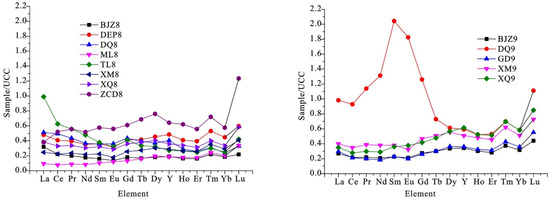 Rare earth elements and yttrium enrichments in coal are similar (Figure 13). Three enrichment types [8,48] are categorized as follows: L-type (light REY; LaN/LuN > 1), M-type (medium-REY; LaN/SmN < 1, GdN/LuN > 1), and H-type (heavy REY; LaNLuN < 1). BJZ8, DQ8, and TL8 are L-type coal samples, and the remaining No. 8 coal samples are heavy rare earth element-based. The majority of No. 9 coal samples are H-type and DQ9 is M-type (Table 7).