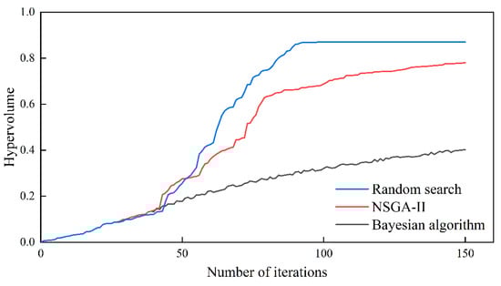 When establishing the NSGA-II algorithm, the initial population size, initial crossover rate, and initial mutation rate were set to 50, 0.6, and 0.1, respectively. The random search algorithm is a random sampling in the input space; in the evaluation of random sampling input target value, if the sampling target value does not produce a positive improvement, then there is a need to re-sample the input and repeat the process, until there is a positive improvement in the target value. For each algorithm, Figure 2 shows the hypervolume measurements calculated using the multi-objective optimization function with constraints, and Table 1 lists the hypervolume measurements of the three algorithms in the final constraint evaluation.
