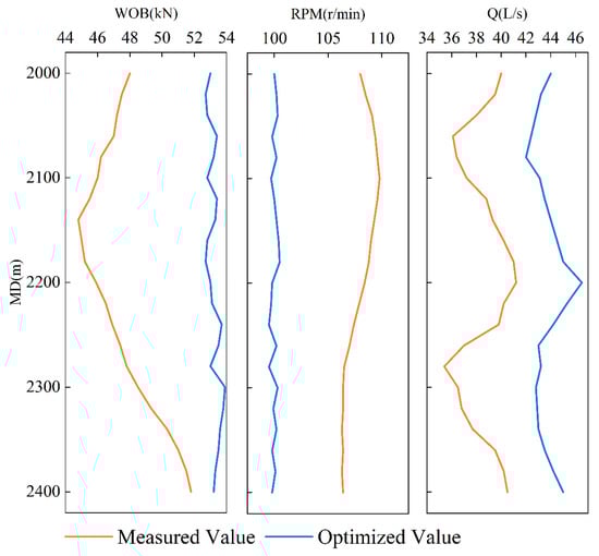 The unknown coefficient value in the model can be determined from field drilling and relevant data. The Bayesian optimization algorithm was used to calculate the model of the well section drilled by each bit, and the optimal drilling parameter combination of WOB, RPM, and flowrate (Q) was calculated. The calculation results for the drilling-parameter combination are shown in Figure 3. The orange curve in the figure shows the WOB, RPM, and Q of the production well during actual drilling, whereas the blue curve shows the corresponding parameter values after optimization. The figure shows that the optimized WOB was higher than the WOB value in the actual drilling process of the well, and the optimized RPM was stable and slightly lower than that in the actual drilling process. The optimized Q, which was larger than Q in the actual drilling process, fluctuated significantly with the well depth, and the trends of the two curves were consistent.