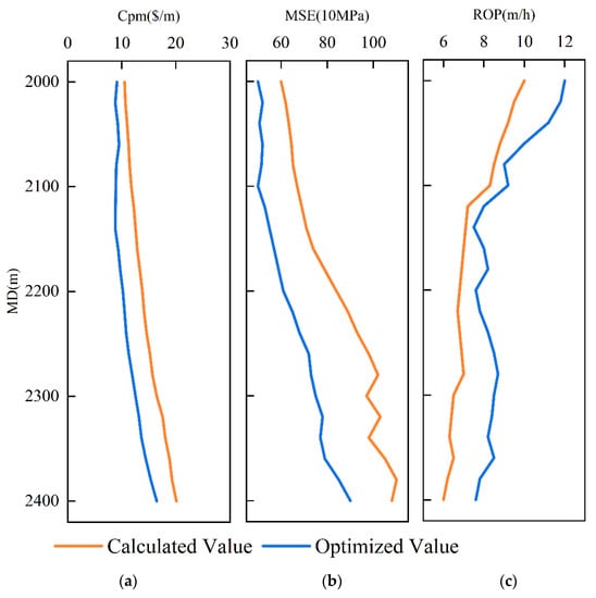 Figure 4a,b show a comparison of the drilling cost per meter and the mechanical specific energy before and after the optimization of the drilling parameters. The drilling cost significantly reduced after the optimization of drilling parameters, which is about 18% less than that before optimization. and it fluctuated within a small range against the increase in depth with the optimized WOB and RPM. This experimental results show that the optimization of the WOB, RPM, and Q parameters can effectively optimize the drilling cost; moreover, a before-and-after comparison of the mechanical specific energy shows that the mechanical specific energy after optimization is reduced by about 20% compared with that before optimization. The definition of mechanical specific energy shows that the size of the mechanical specific energy value is related to the type of bit, degree of wear of the bit, effectiveness of drilling chip removal, and type and nature of the rock; the lower the mechanical specific energy value, the higher the rock-breaking efficiency of the bit. For a given drill bit, such as that limited by the implementation of this study, the mechanical specific energy of the drill bit can be reduced by optimizing only WOB, RPM, and Q. A comparison of these two sets of experimental data shows that a reasonable WOB, RPM, and Q for a given bit can reduce the cost consumption and achieve efficient drilling.
