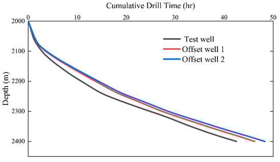 Figure 8 shows the relationship between the cumulative drilling time and depth. On average, compared with the adjacent wells that did not use the drilling parameter optimization method, the test wells that used the drilling parameter optimization required approximately 4.5 h less, saving approximately 10% of the drilling time.