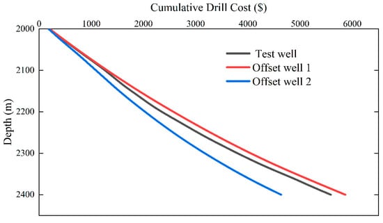 Figure 9 shows the relationship between the cumulative drilling cost and depth. On average, compared with the adjacent wells that did not use the drilling parameter optimization method, the test wells that used the drilling parameter optimization required approximately 1000 USD less, saving approximately 18% of the drilling cost.