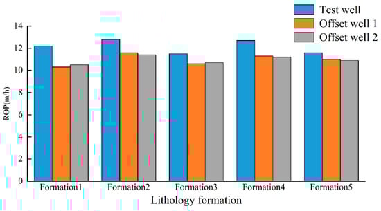 Similarly, the above test well was used for comparison and analysis with an adjacent well. The adjacent well was not optimized using the Bayesian optimization method. To reduce the impact of other factors on the drilling performance and ensure that the test and adjacent wells used the same bit and bottom-hole assembly (BHA), we selected the adjacent well for comparison to ensure that they had similar formations and that the comparison process would not be affected by the formations.