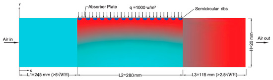 The solution domain was designed to be in the form of a rectangular duct (Figure 1). The underneath of the absorber plate at the top of the duct is the only part of the plate that has a semi-circular rough surface attached to it. The other sides have a smooth surface. In the current investigation, the flow domain was modelled as a rectangular duct, which is identical to the duct that Chaube, Sahoo, and Solanki [18] investigated. There are three sections in a duct, as shown in Figure 1, within the whole duct geometry. It is important to note that the length of first and last sections are specified according to the ASHRAE Standard 93-2003 for turbulent flow regimes [30].
