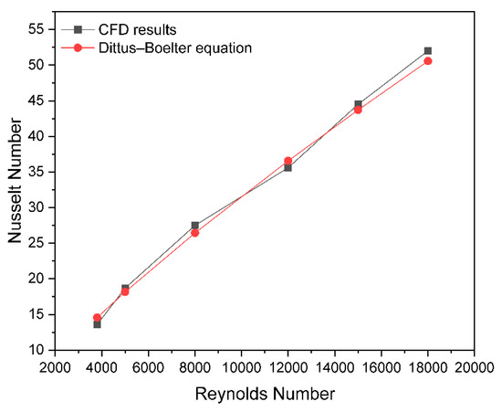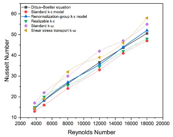 In Figure 3, a comparison is made between the variation in the Nur with Re when utilizing various turbulence models and the results derived from Equation (6).