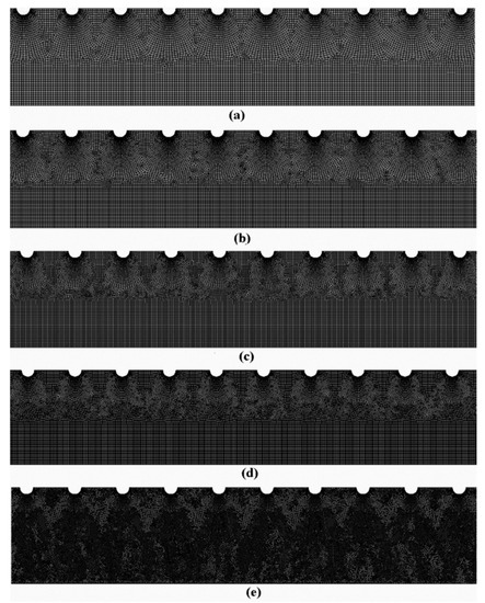 The computational grids with cell numbers of (a) 44,473, (b) 68,524, (c) 84,622, (d) 112,226, and (e) 242,106.